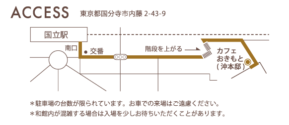 1933( 昭和 8 )年に建てられた国登録有形文化財「沖本家住宅」をリノベーションしたカフェ。600 坪の広々とした敷地には、多品種の花や木々が植えられ各種イベントなども開催されています。( JR 国立駅南口より徒歩8分 )