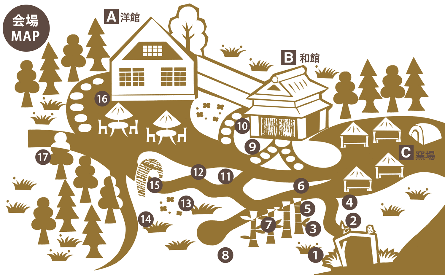 9.28 (日) ー 10.13 (月祝) 上記のカフェおきもと営業時間内にて※丸数字は会場MAPとリンクしています。